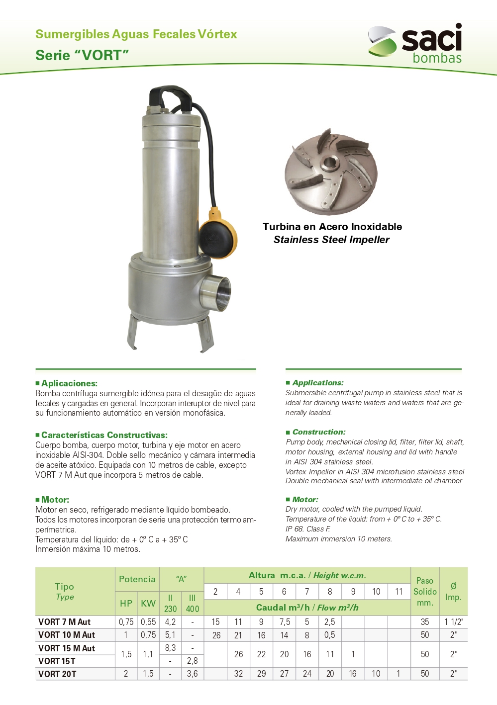 Bombas centrífugas submersíveis, inteiramente de aço inoxidável AISI-304, ideais para a drenagem de esgoto e água carregada em geral. Eles incorporam um interruptor de nível para operação automática em uma versão monofásica.